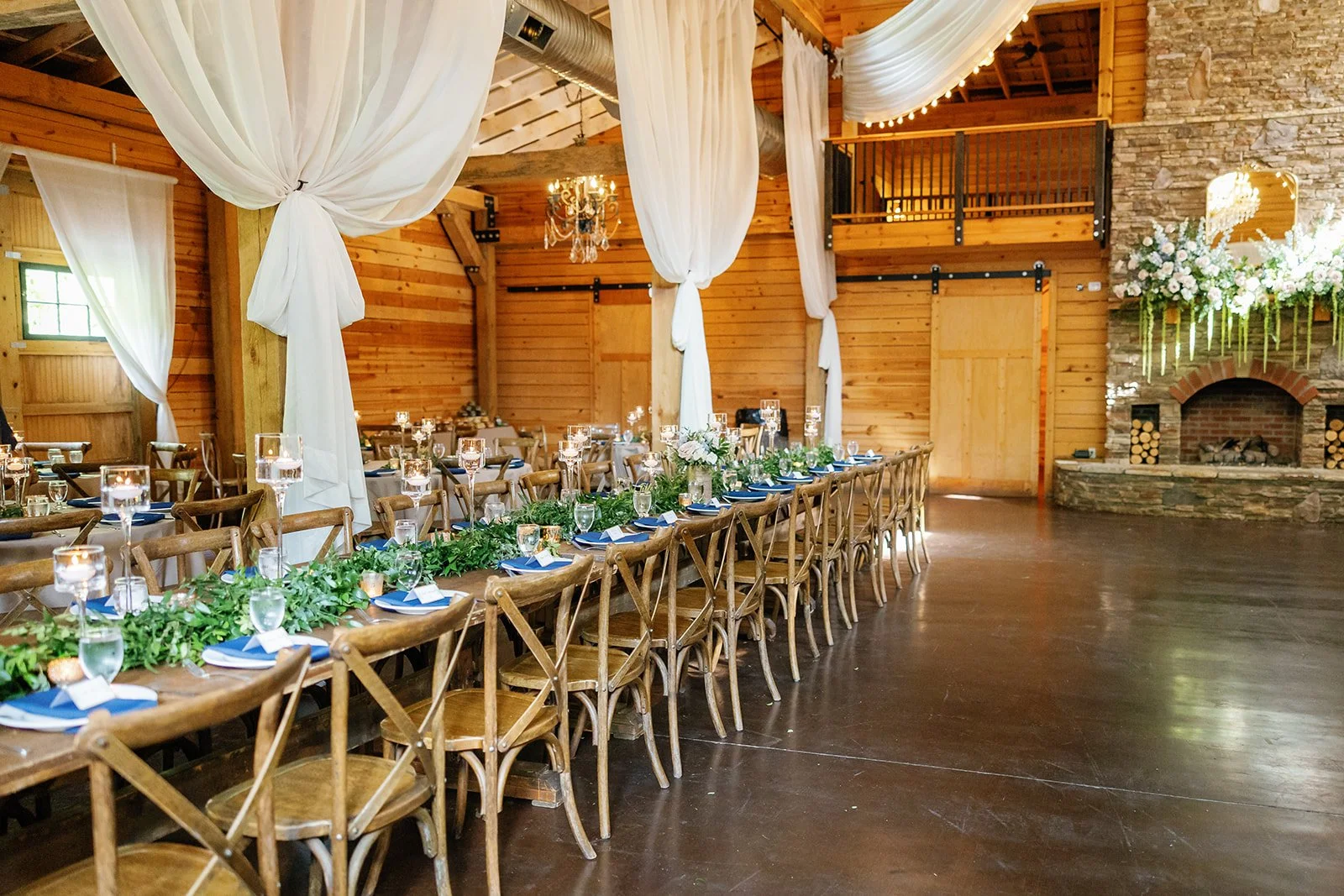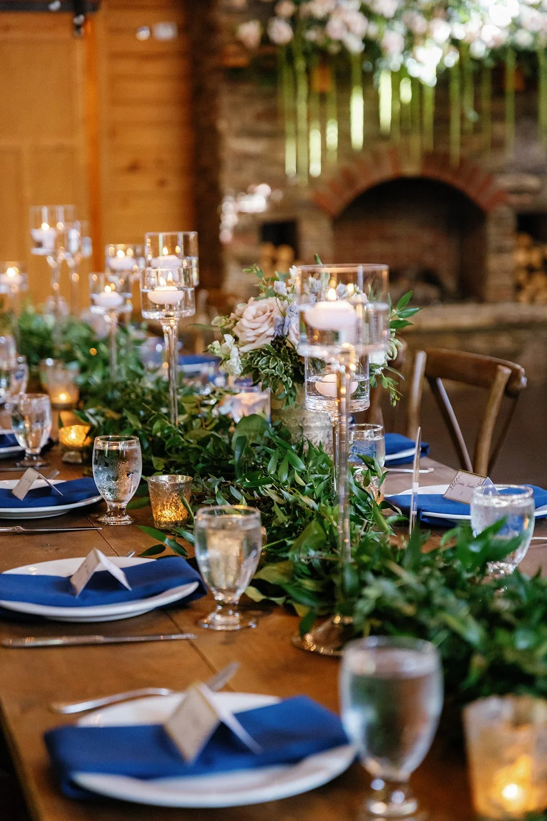 The Wheeler House reception was a masterclass in rustic sophistication. Long wooden farm tables were lined with garlands of greenery and flickering candles, while crisp navy napkins added a touch of modern polish.