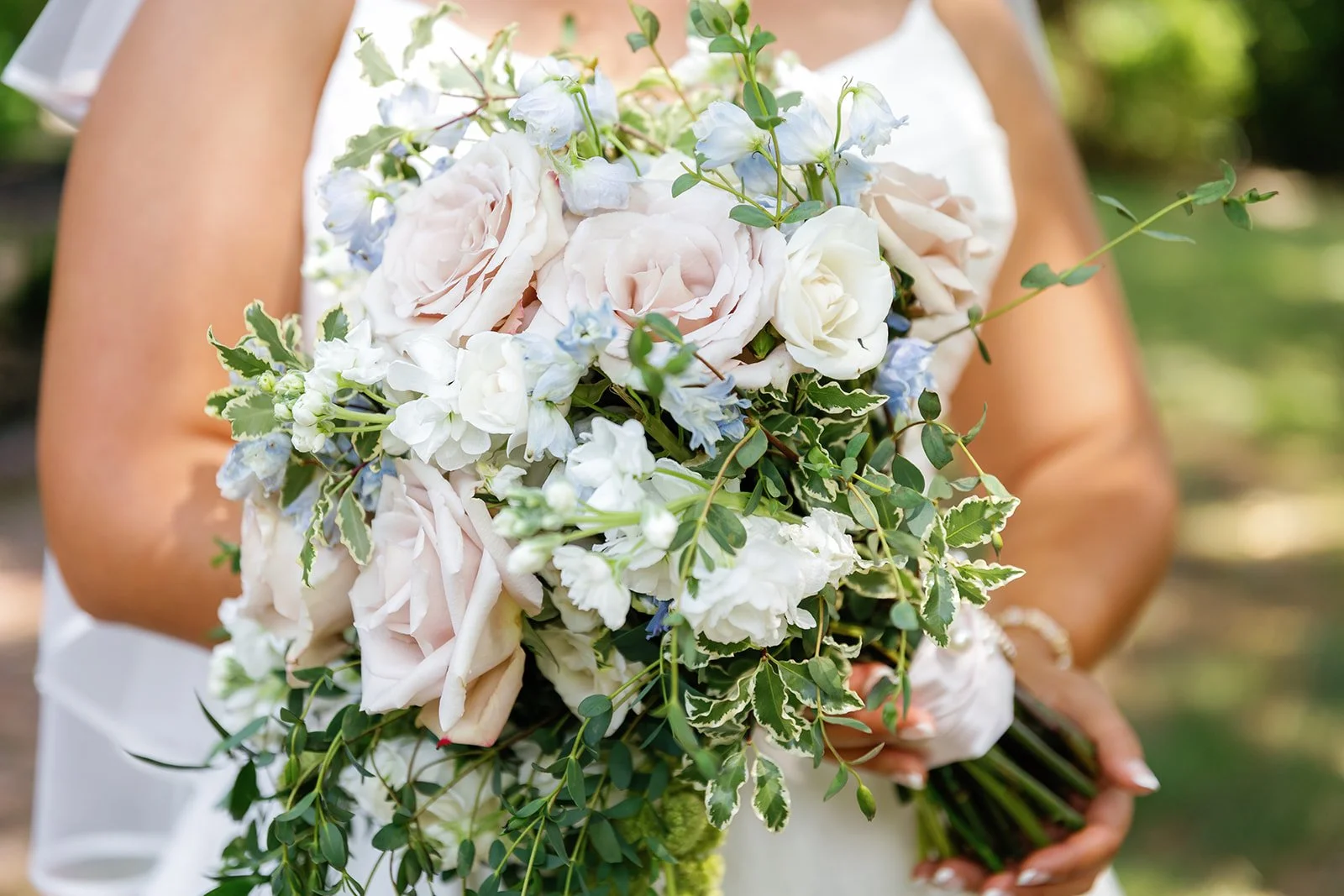 The floral design brought the beauty of a lush garden indoors, featuring soft blush roses, delicate ivory blooms, and rich greenery that framed the day with elegance.